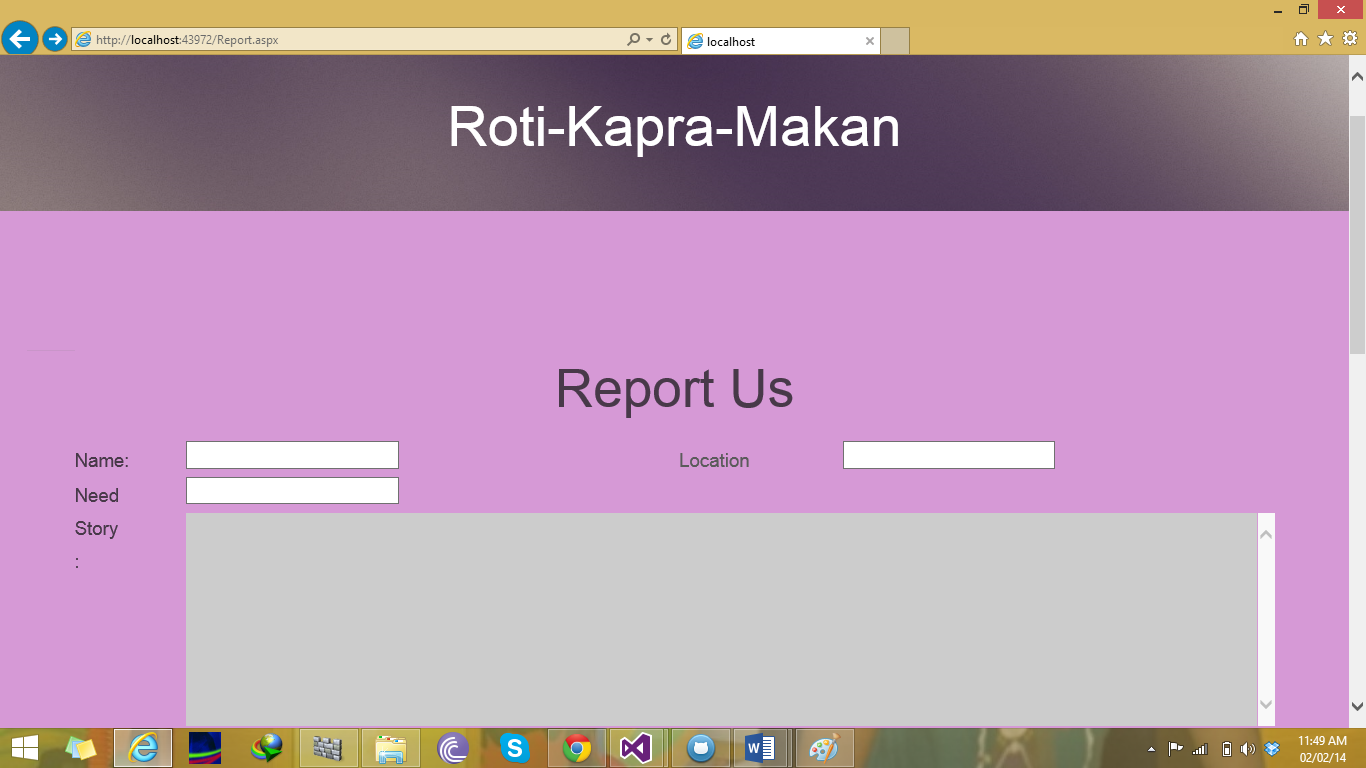 Roti Kapra Makan is an integrated system of a Website (www.roti-kapra-makan.azureservices.net), a smartphone app & a SMS service (in future) working in coherence to ensure our applications wide reach to general public, both to specify donors & to meet their needs.