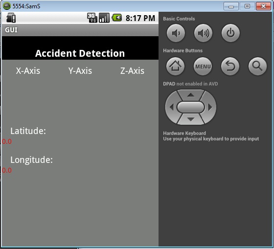 The user needs to start the app before it will be able to send rescue notifications to the monitoring system. This app uses accelerometer’s readings to detect accidents and on the basis of those readings inform the monitoring system about the accident location using the GPS coordinates.